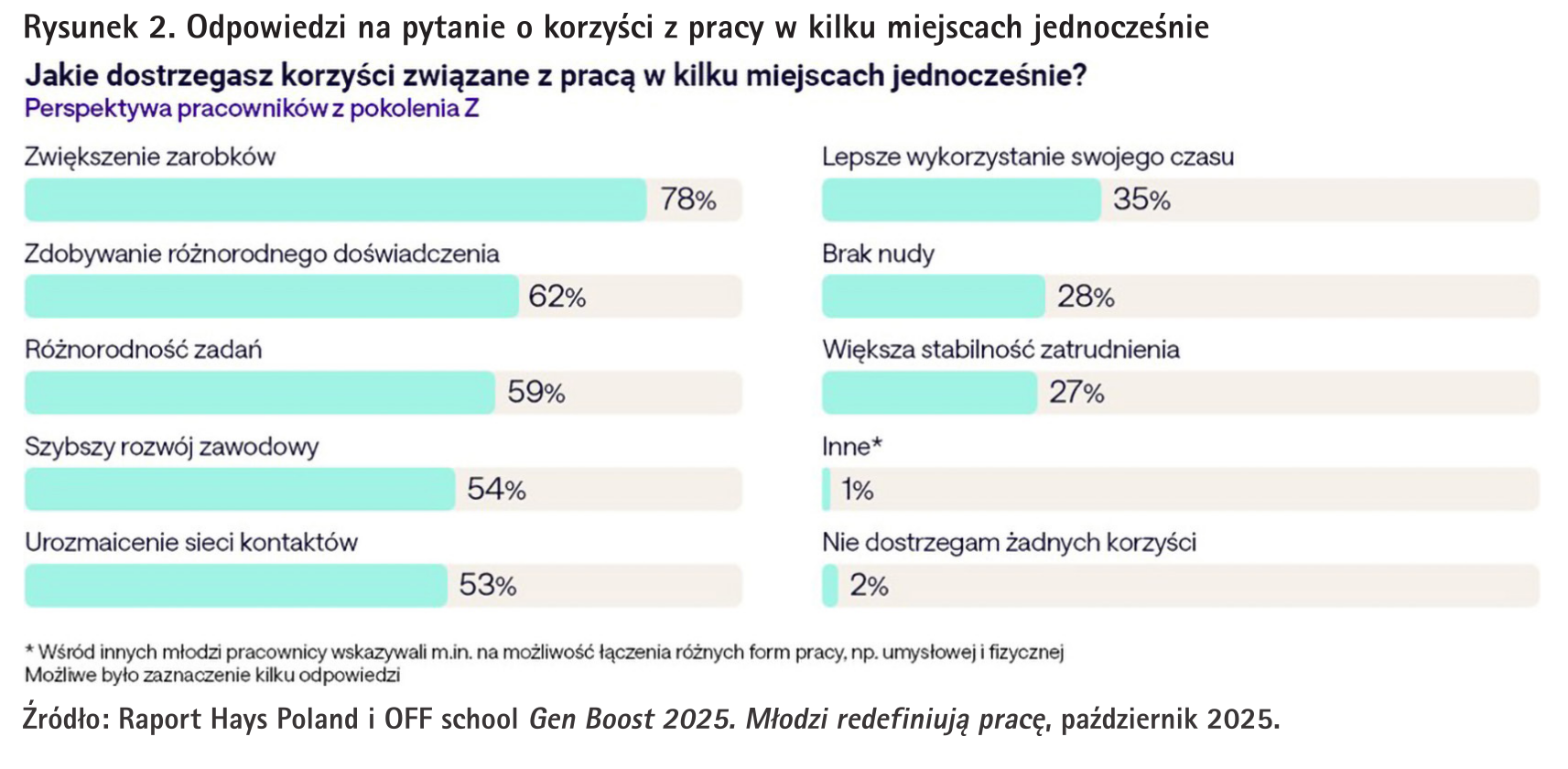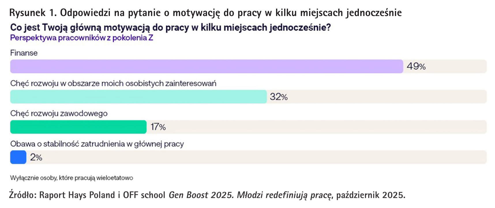 Badanie agencji doradztwa personalnego Hays Poland i Fundacji OFF school, opisane na łamach raportu Gen Boost 2025. Młodzi redefiniują pracę, pokazuje, iż młodzi zdają sobie sprawę z tego, że wieloetatowość nie jest rozwiązaniem idealnym. Wybierają je jednak świadomie, jako główną motywację, wskazując kwestie finansowe i możliwość rozwoju w obszarze zainteresowań. Młodzi są też bardziej przychylni tej koncepcji niż pracodawcy. O ile pracę w kilku miejscach jednocześnie negatywnie ocenia tylko 11 proc. Zetek, to w przypadku pracodawców odsetek ten jest aż trzykrotnie wyższy (rys. 1).