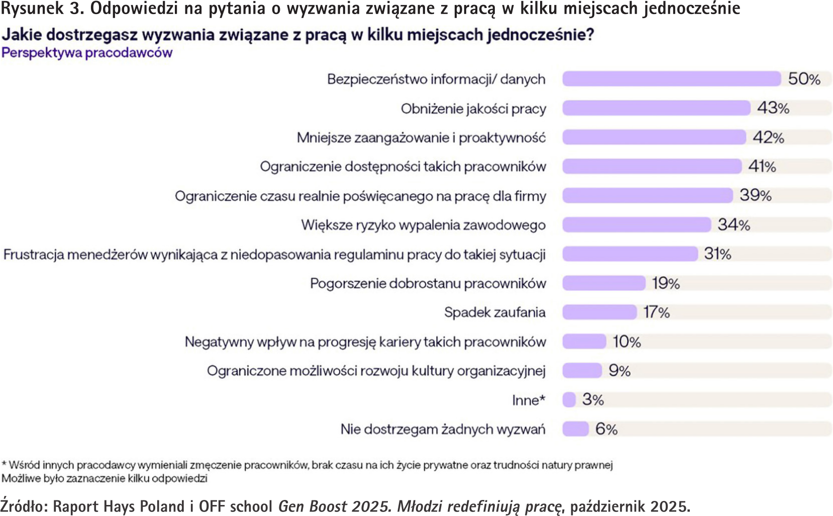 Z kolei dla firm największą słabością takiego rozwiązania są przede wszystkim wyzwania natury prawnej i HR. Główne obawy pracodawców dotyczą bowiem bezpieczeństwa informacji lub danych oraz jakości pracy zaangażowania wieloetatowców. W oczach szefów wyzwaniem może być również ograniczenie dostępności takich pracowników (rys. 3).