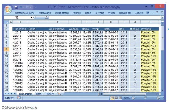 Na początku jednak musimy pozyskać dane, które będziemy przetwarzać i analizować. Należy pamiętać, że – aby dane te mogły być przetwarzane wielowymiarowo – powinny mieć tzw. układ bazodanowy. Pod tym pojęciem rozumiem układ, w którym każde kolejne zdarzenie (transakcja) jest oddzielnym rekordem (wierszem), składającym się z danych opisowych oraz miar (wartości). W naszym hipotetycznym przykładzie wykorzystamy transakcje dokonywane przez poszczególnych handlowców w ramach województw. Każda transakcja opisana jest za pomocą wartości, marży oraz wyniku równego iloczynowi marży i wartości transakcji. Nie rozstrzygamy tutaj, czy są to usługi, produkty czy inne dobra podlegające obrotowi gospodarczemu.