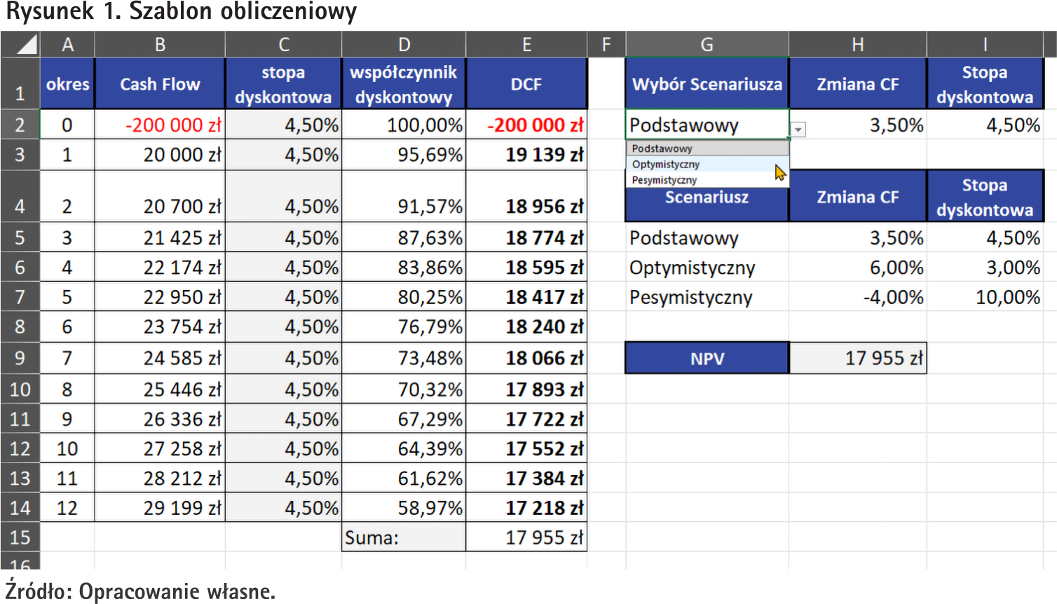 Stopa dyskontowa oznacza pojedynczą zmianę. Oznacza, że z każdym kolejnym rokiem przepływ pieniężny z inwestycji jest procentowo coraz mniej wart. Ten skumulowany procent spadku wartości pieniądza to właśnie współczynnik dyskontowy. W tym przykładzie dla scenariusza podstawowego widzimy, że w pierwszym okresie rozliczeniowym pieniądze mają tylko 95,69% (=1/(1+C3)^A3) swojej wartości z zerowego okresu inwestycji, a w drugim okresie wartość nabywcza pieniędzy spada do 91,57%.