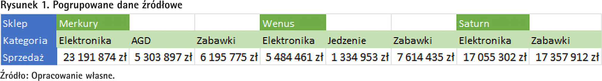 Żeby zgrupować dane na wykresie, czyli pokazać zarówno przykładową kategorię, jak i jej podkategorie, wystarczy odpowiednio przygotować nagłówki danych. Kategoria wyższego poziomu powinna pojawić się tylko w pierwszej komórce rozpoczynającej wszystkie elementy poniższej grupy. Opisy najniższej podkategorii powinny znaleźć się w każdej komórce. Przykładowy układ danych pokazuje rys. 1.