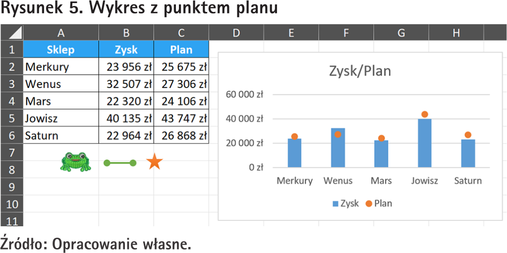 Czasami chcemy na wykresie podkreślić osiągnięcie jakiejś wartości (planu czy celu). Standardowo można dodać dwie serie na wykresie i jedną zamienić na wykres punktowy, co pokazuje rys. 5.