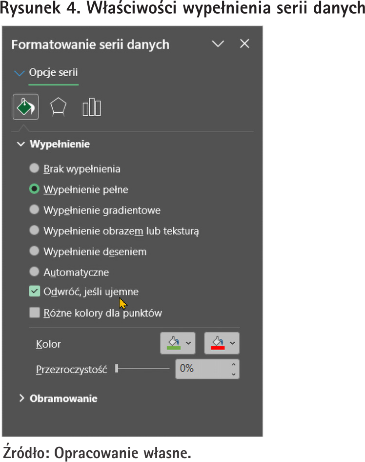 Żeby uzyskać taki efekt, należy zaznaczyć serię danych i nacisnąć skrót klawiszowy Ctrl + 1, który otworzy okno formatowania wykresu. W nim należy przejść do grupy właściwości „Wypełnienie” (kubełek z farbą) i zaznaczyć checkbox „Odwróć, jeśli ujemne”. Potem wystarczy tylko dopasować kolory wypełnienia serii dla wartości dodatnich i ujemnych, tak jak pokazuje to rys. 4.