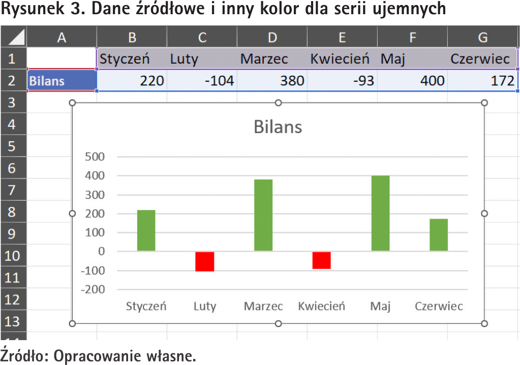 Czasami potrzebujemy wyróżnić na wykresie zysk i stratę, czyli odróżnić od siebie wartości ujemne i dodatnie. Wykresy mają odpowiednią właściwość, żeby dało się to zrobić z jedną serią, jak pokazuje to rys. 3.