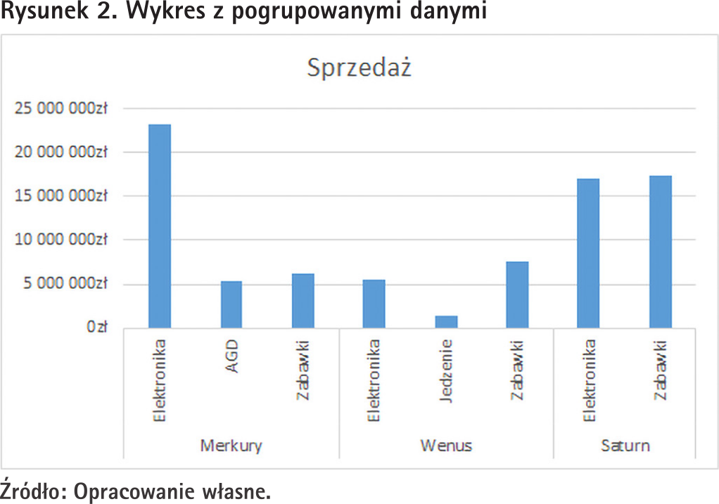 W przykładowych danych źródłowych można zobaczyć, że kategorie mogą być różnej wielkości oraz mieć różne podkategorie. Niejako automatyczne podobne grupowanie odbywa się w tabelach przestawnych i wykresach przestawnych, ale również z prostymi danymi można uzyskać efekt grupowania na wykresie. Wystarczy zaznaczyć wszystkie komórki z danymi (również puste nagłówki), a następnie wstawić przykładowy wykres kolumnowy. Wykres stworzony na przykładzie danych źródłowych pokazuje rys. 2.