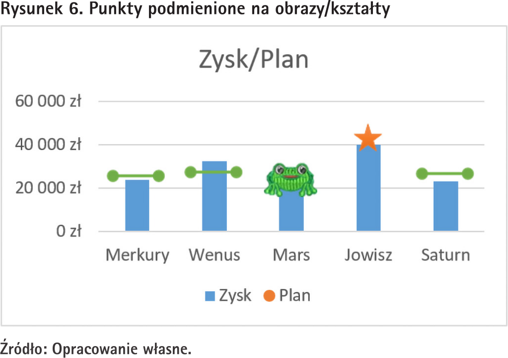 Jednak domyślne opcje punktów (znaczników) są dość ubogie. Na szczęście w miejsce domyślnych punktów można wstawić dowolny kształt, a nawet obraz. Wystarczy najpierw taki obraz/kształt wstawić do arkusza Excela, następnie go skopiować, a potem zaznaczyć wszystkie znaczniki lub pojedynczy znacznik na wykresie i wkleić skopiowany obraz/kształt. Przed skopiowaniem trzeba dopasować rozmiar kształtu, żeby wielkością pasował do rozmiaru danych na wykresie. Wykres z przykładowymi wklejonymi kształtami/obrazami pokazuje rys. 6.