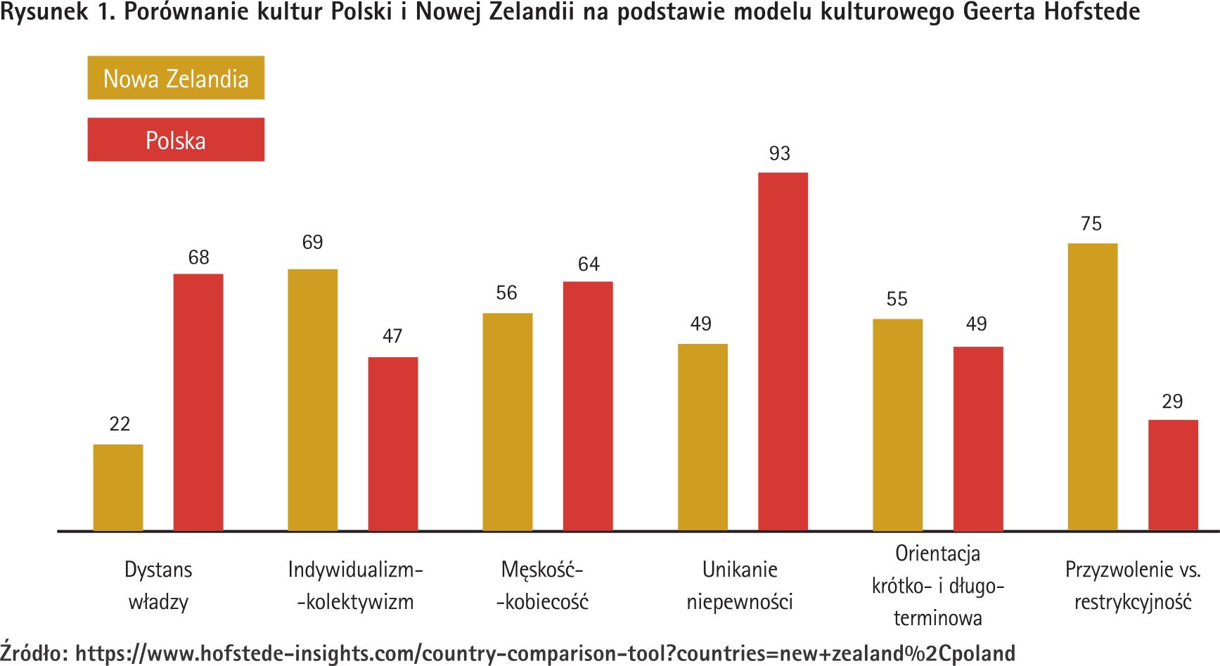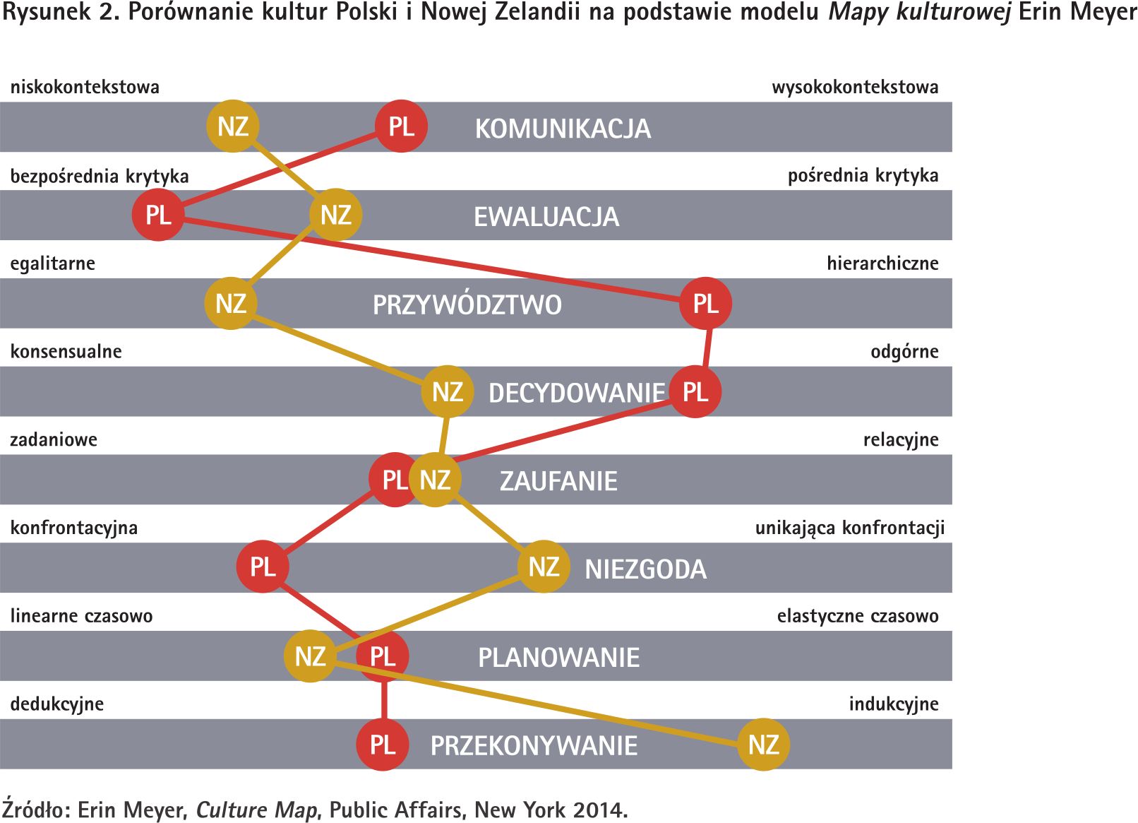 Tak właśnie wygląda kultura Nowej Zelandii w skrócie. Przyjrzyjmy się podobieństwom i różnicom między tą właśnie kulturą a naszą rodzimą kulturą polską. Skorzystamy z dwóch modeli kulturowych – Geerta Hofstede (Rysunek 1) oraz mapy kulturowej z modelu Erin Meyer (Rysunek 2). Zacznijmy od podobieństw.