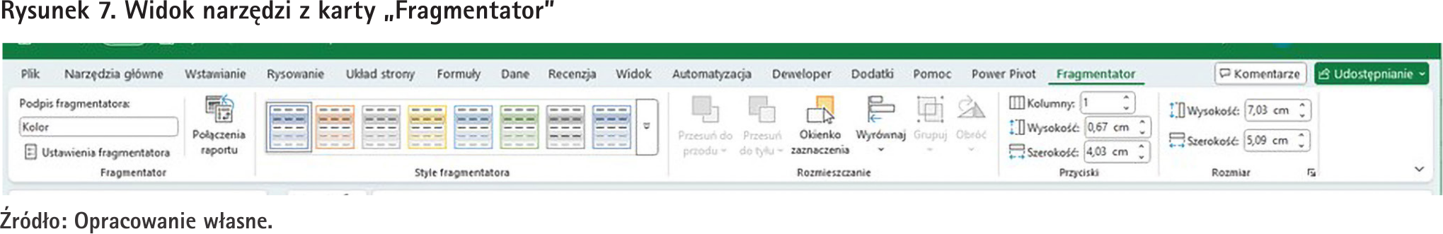 Mając wstawiony fragmentator, być może będziemy chcieli go w jakiś sposób sformatować lub zmodyfikować. Służą do tego narzędzia dostępne na wstążce na karcie „Fragmentator”, która jest widoczna po zaznaczeniu naszego fragmentatora. Widok narzędzi z tej karty pokazuje rys. 7.