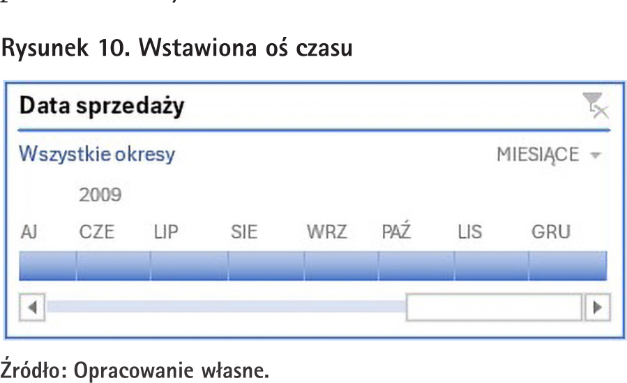 W prawym górnym rogu tej osi jest możliwość zdecydowania, według jakich przedziałów czasowych chcemy filtrować naszą tabelę przestawną. Do wyboru mamy lata, kwartały, miesiące (aktualnie wybrane na pokazanej na rys. 10 osi czasu) oraz dni. Po tym wyborze będziemy mogli w centralnej części tej osi ustawiać za pomocą suwaków, które wartości mają być odfiltrowane (te suwaki są widoczne z lewej i prawej strony niebieskiego paska widocznego na osi czasu. W momencie, gdy zawęzimy wybrany przedział, będą się one pojawiać z lewej i prawej strony wybranego przedziału).