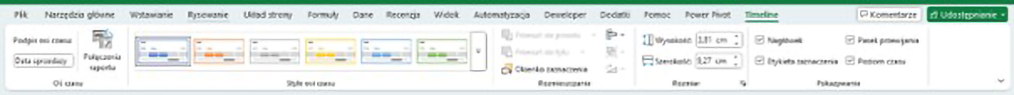 Z lewej strony jest również galeria ze stylami osi czasu, z której można wybierać, jak nasza oś czasu ma wyglądać. Natomiast prawa strona tej karty to narzędzia do decydowania, które elementy osi czasu mają na niej być widoczne. Dzięki temu możemy tę oś czasu dopasować do naszych potrzeb i oczekiwań.