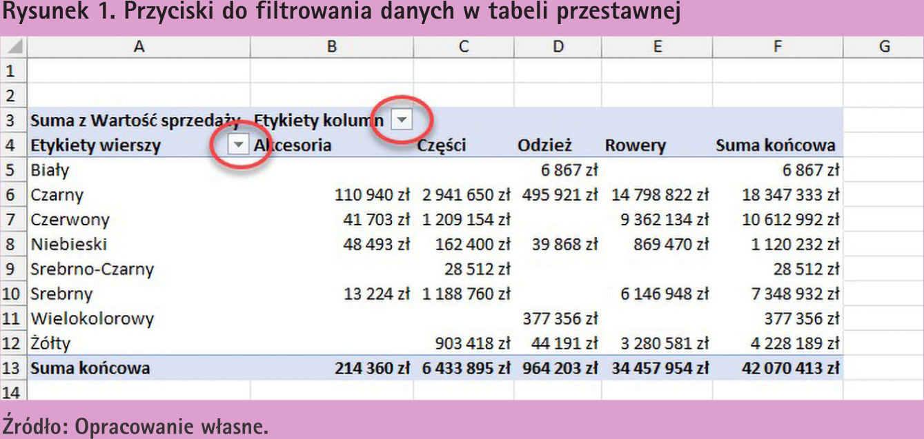 Jeśli pracujemy w Excelu z tabelami przestawnymi, może się zdarzyć, że będziemy potrzebować w pewien sposób przefiltrować dane, które są pokazywane w tabeli przestawnej. Takie filtrowanie można wykonać na kilka sposobów. Pierwszym, tradycyjnym sposobem jest wykorzystanie przycisków do filtrowania w tabeli przestawnej, które są dostępne w momencie, gdy dodamy jakieś pole do obszaru wierszy i/lub kolumn w tej tabeli. Przyciski te dla przykładowej tabeli przestawnej pokazującej wartość sprzedaży towarów w poszczególnych kolorach dla poszczególnych segmentów przedstawiono na rys. 1.