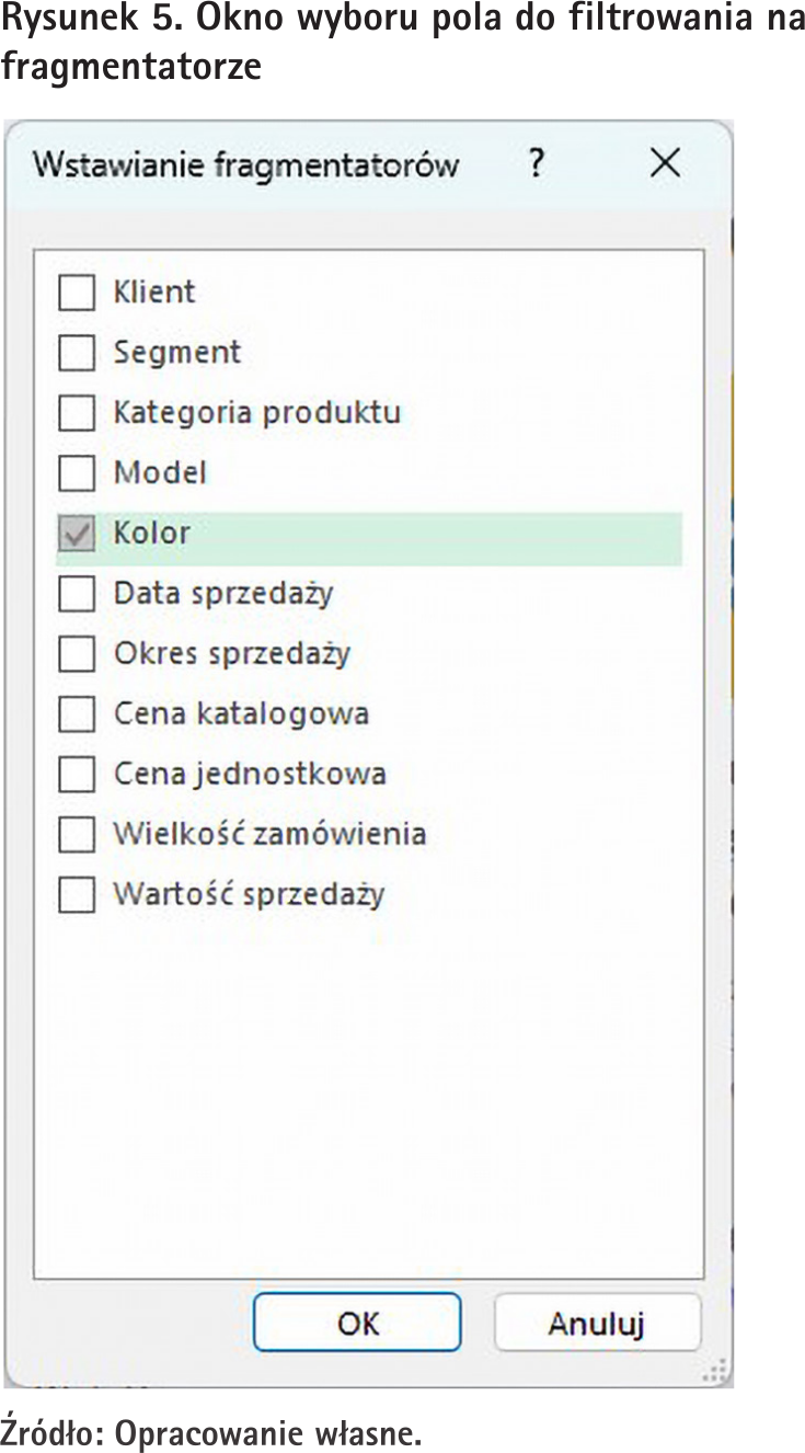 Po wybraniu tego narzędzia pojawi nam się okno, w którym musimy zdecydować, które według którego pola (lub według których pól) będziemy filtrować tabelę przestawną. W naszym przypadku będzie to pole „Kolor”, a okienko wyboru jest pokazane na rys. 5.