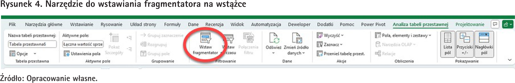 Aby teraz dołożyć fragmentator (ang. slicer) do naszej tabeli przestawnej, wystarczy wejść na wstążce na kartę „Analiza tabeli przestawnej” i wybrać narzędzie „Wstaw fragmentator” pokazane na rys. 4.
