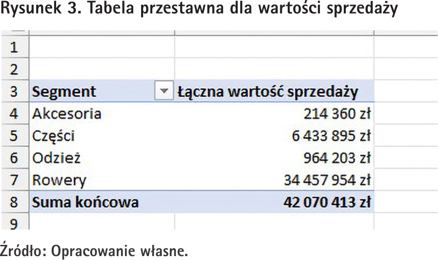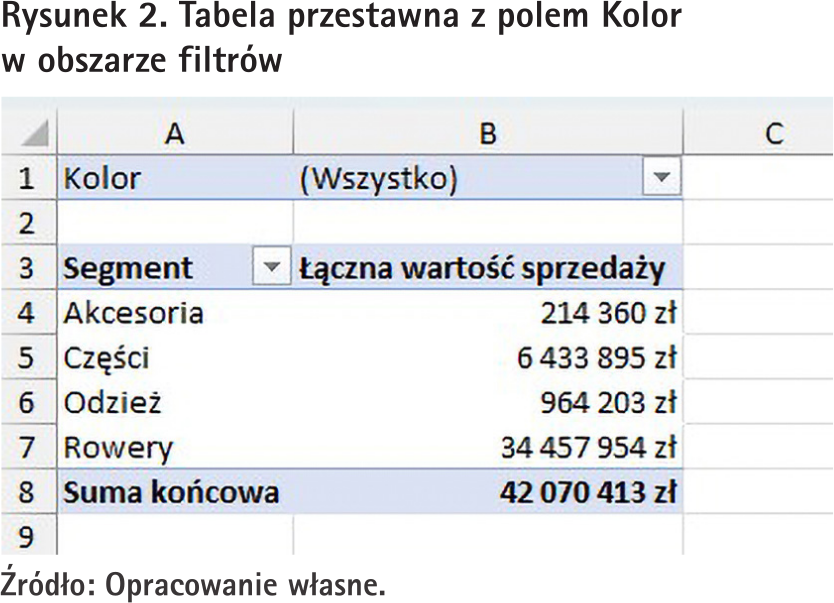 Załóżmy, że mamy tabelę przestawną pokazującą łączną wartość sprzedaży w każdym segmencie towaru (tabela taka została pokazana na rys. 3) i chcemy ją przefiltrować po kolorze towaru.