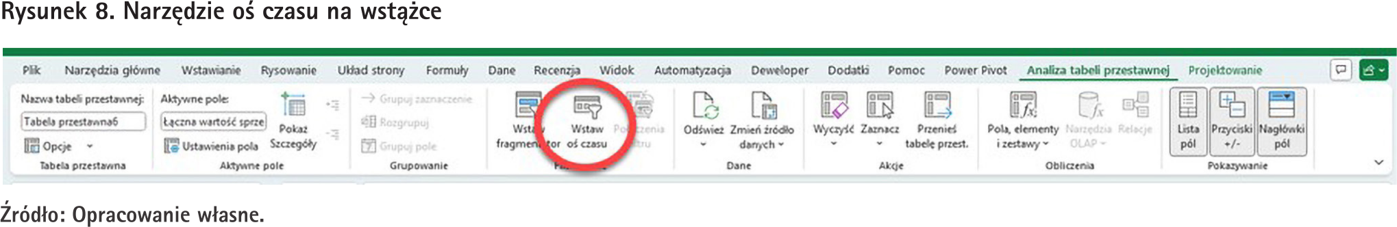 Drugim sposobem filtrowania danych w tabeli przestawnej jest oś czasu. Jest to narzędzie do filtrowania danych zarówno według dat, jak i przedziałów czasowych (lata, kwartały, miesiące i dni). Jeżeli teraz chcielibyśmy do tabeli przestawnej pokazanej na rys. 3 dołożyć oś czasu, to musimy na wstążce na karcie „Analiza tabeli przestawnej” wybrać narzędzie „Wstaw oś czasu”, które zostało pokazane na rys. 8.