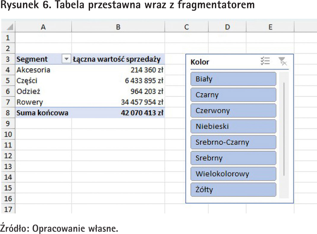 Warto również wspomnieć o jeszcze jednej właściwości fragmentatora. W momencie, kiedy wybierzemy na nim dwie lub więcej opcji, to w tabeli przestawnej będziemy widzieć wartości łącznie dla tych wszystkich wybranych elementów. Czyli jeśli np. na naszym fragmentatorze z kolorami wybierzemy kolory biały i czarny, to w tabeli przestawnej zobaczymy sumę wartości sprzedaży dla towarów w tych dwóch kolorach.