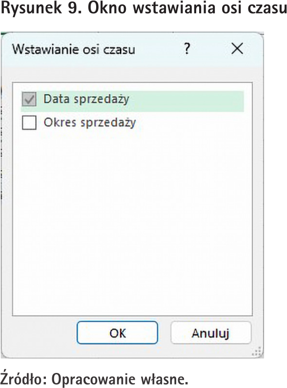 Jeżeli na liście pól tabeli przestawnej mamy więcej niż jedno pole z datami, to pojawi nam się okienko, w którym musimy zdecydować, dla którego pola ma działać wstawiana oś czasu. W naszym przypadku może to być pole „Data sprzedaży”, a wspomniane okienko jest pokazane na rys. 9.